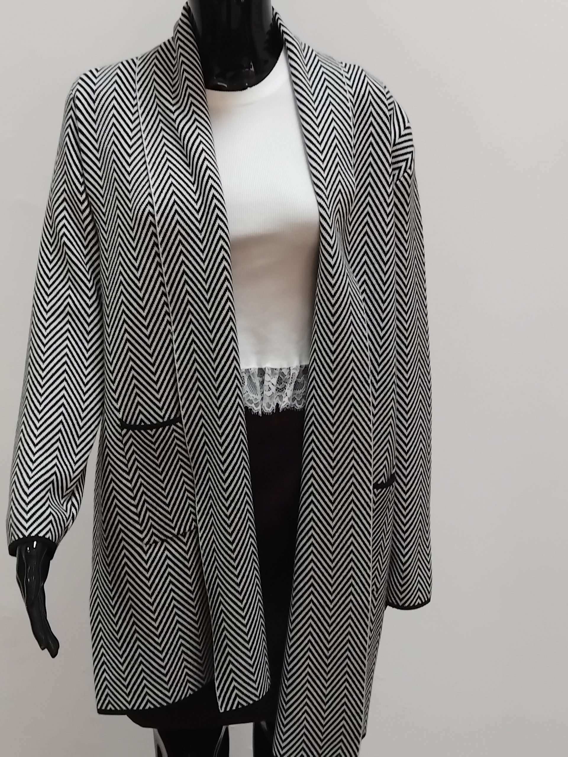 ζακέτα μακριά ζικ-ζκ σχέδιο ασπρόμαυρη με μανίκια και τσέπες στο μπροστινό μέρος
