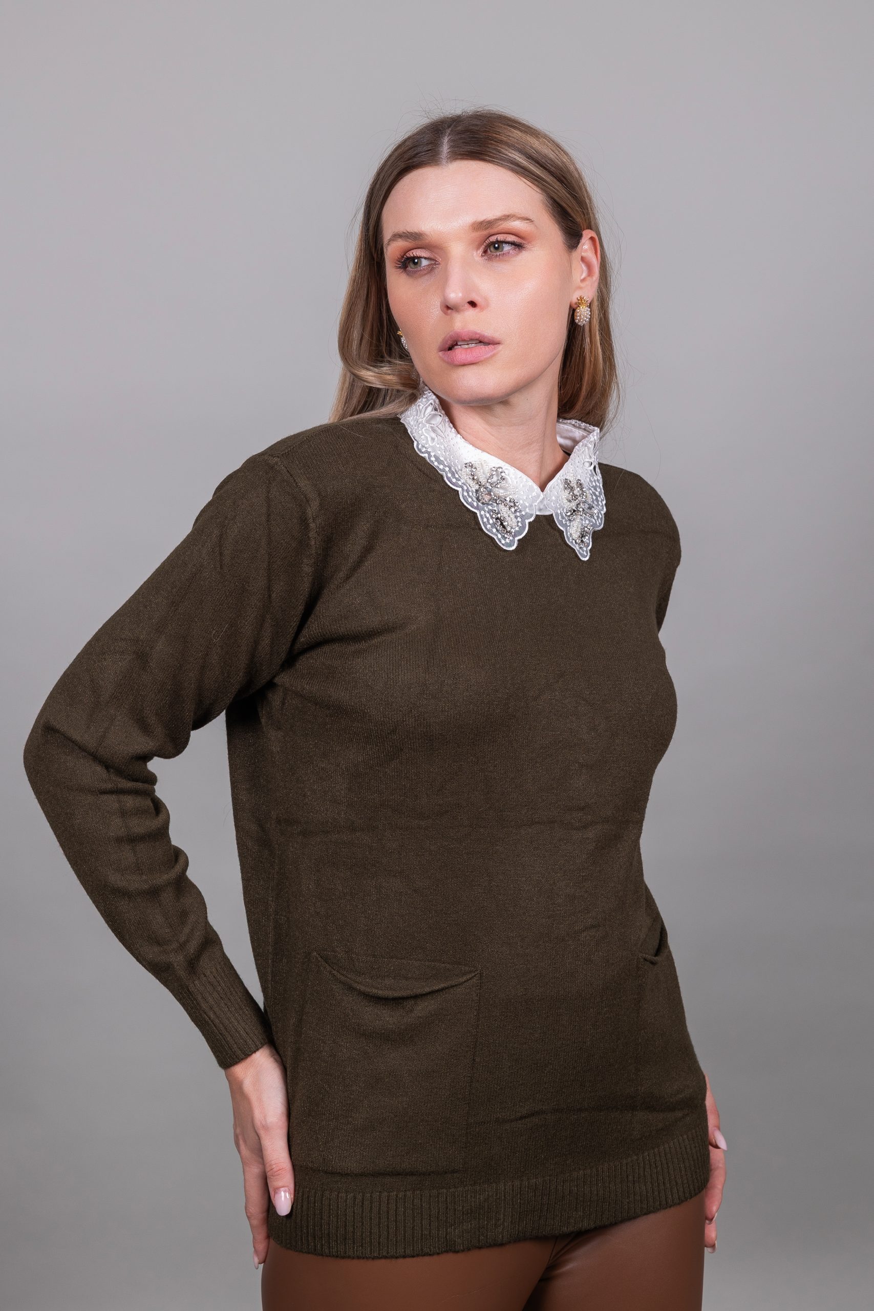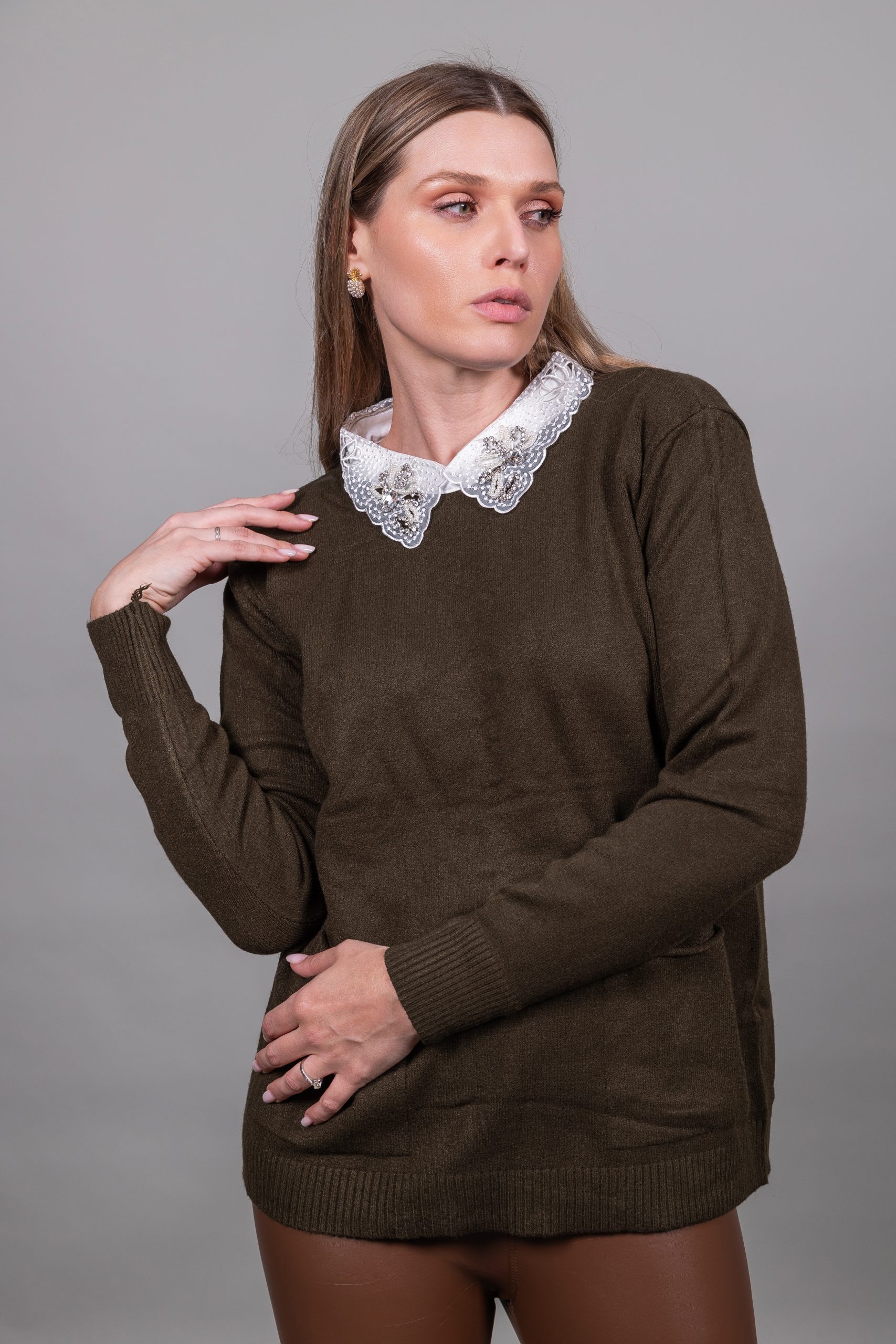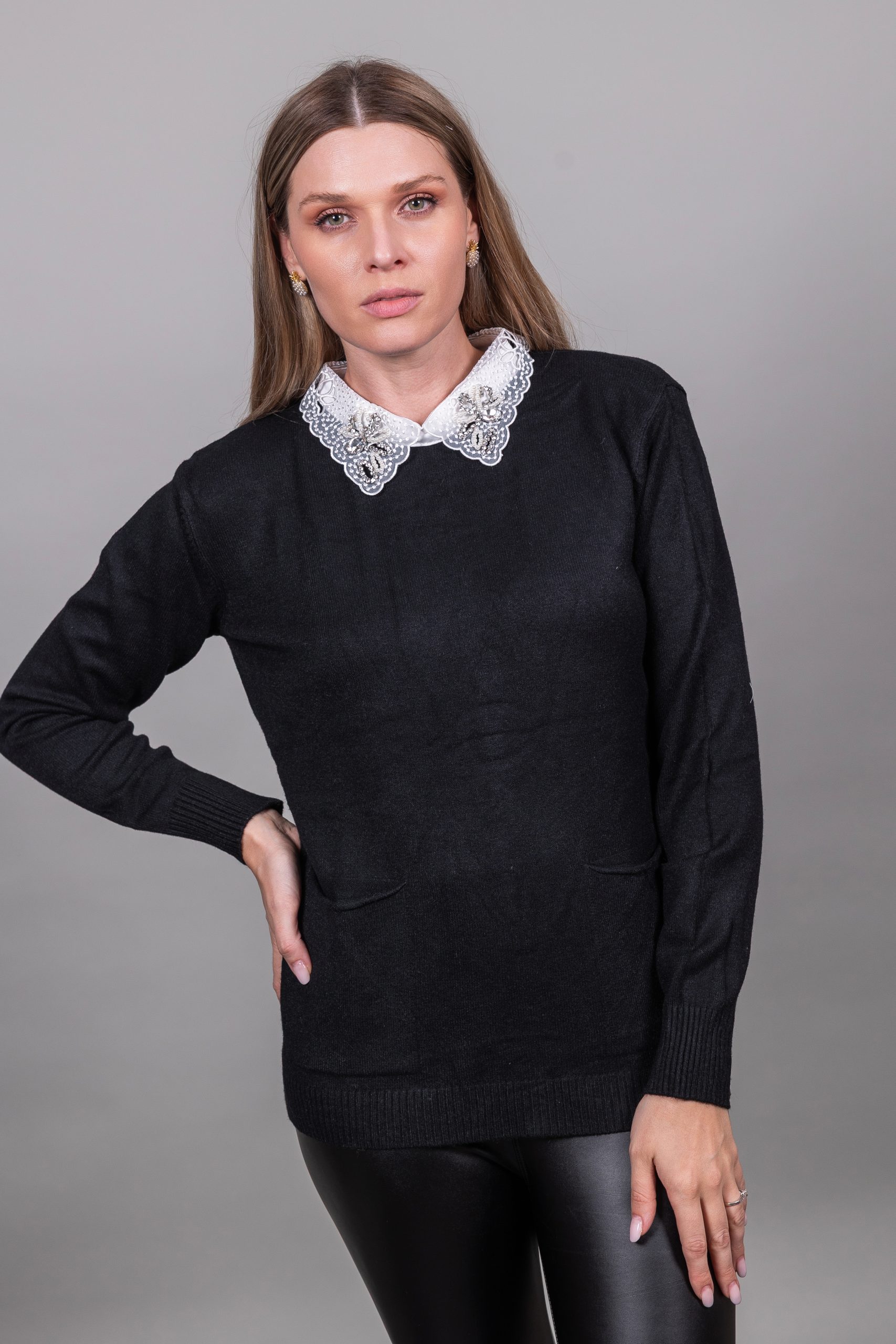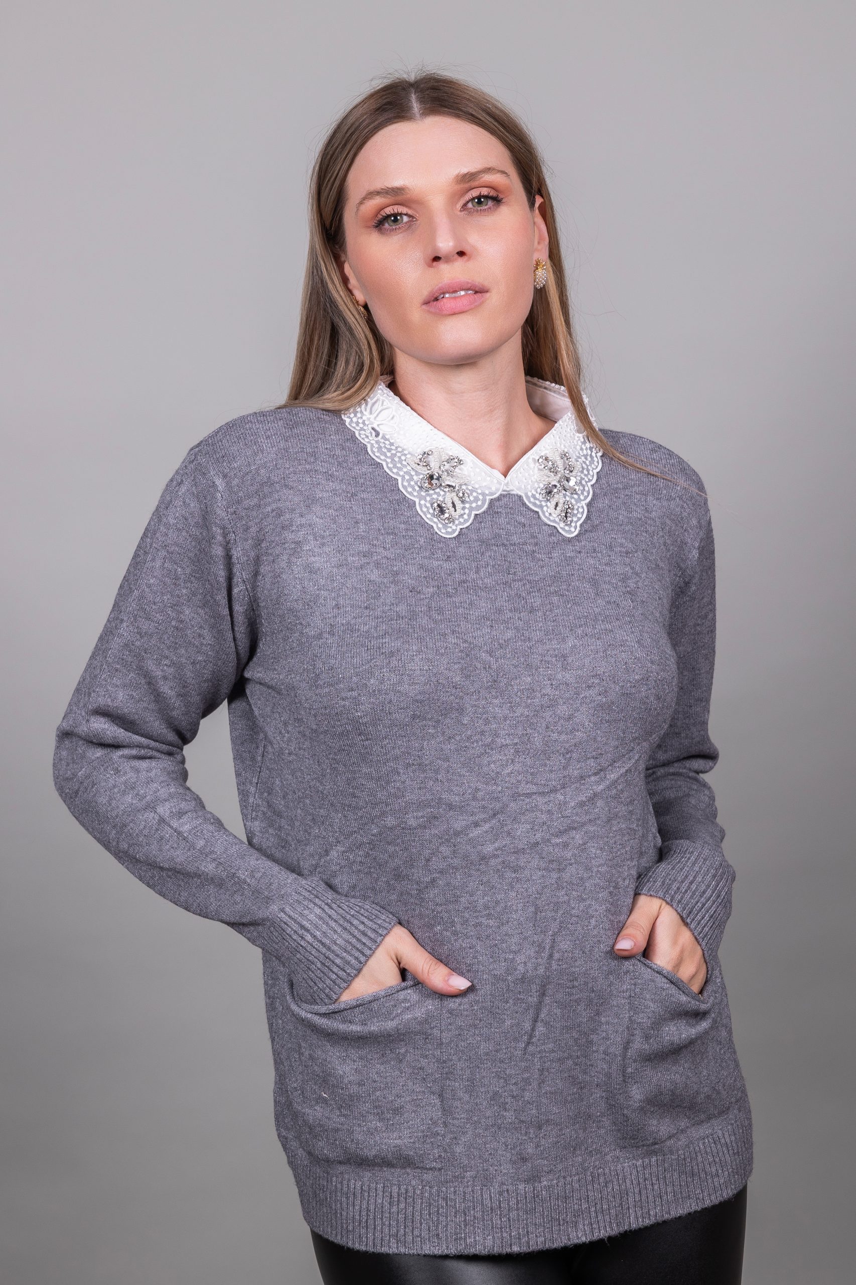 Πουλόβερ με γιακά δαντέλας και πέτρες με τσέπες