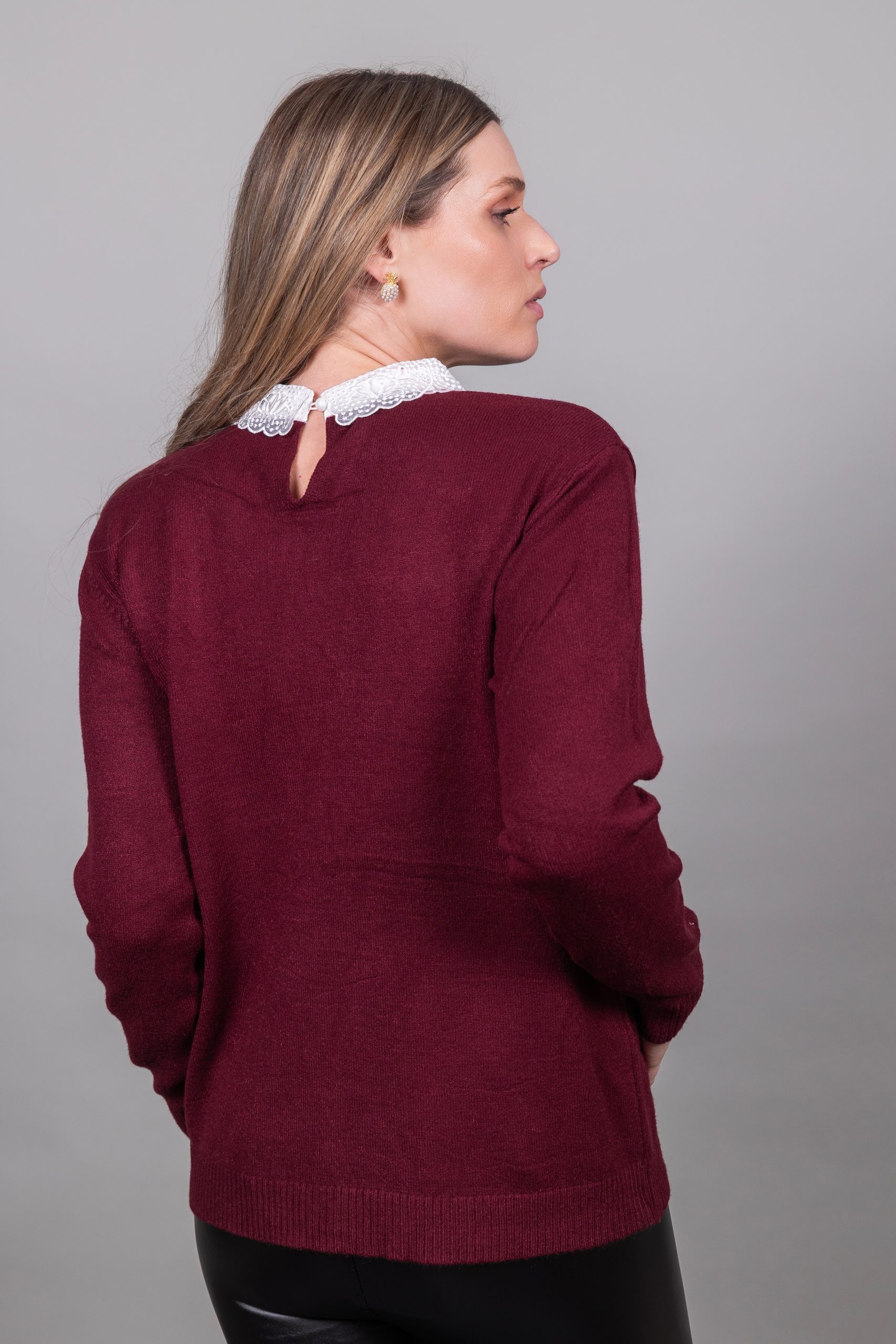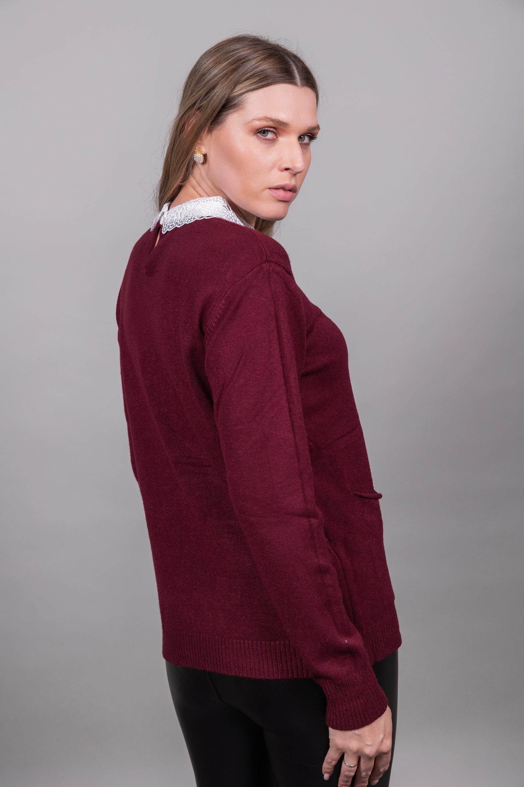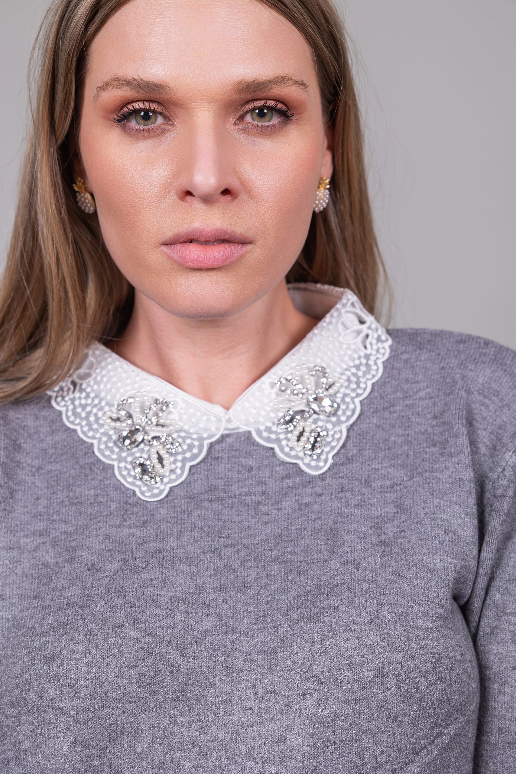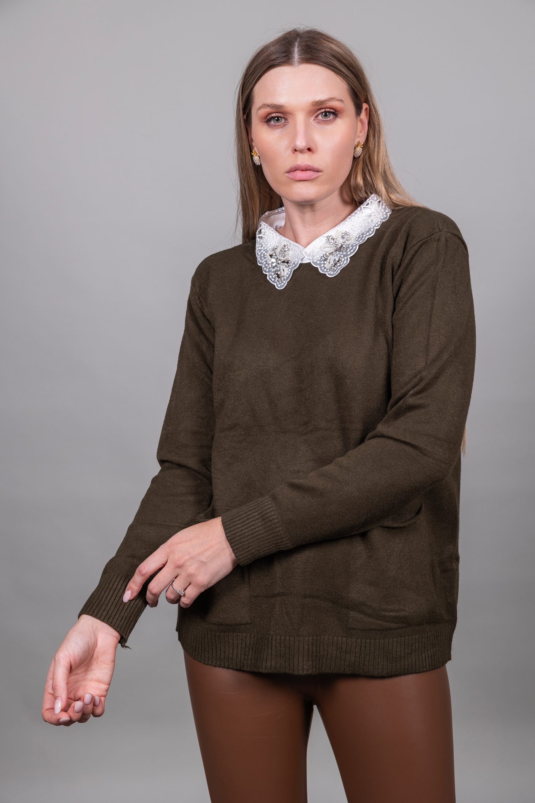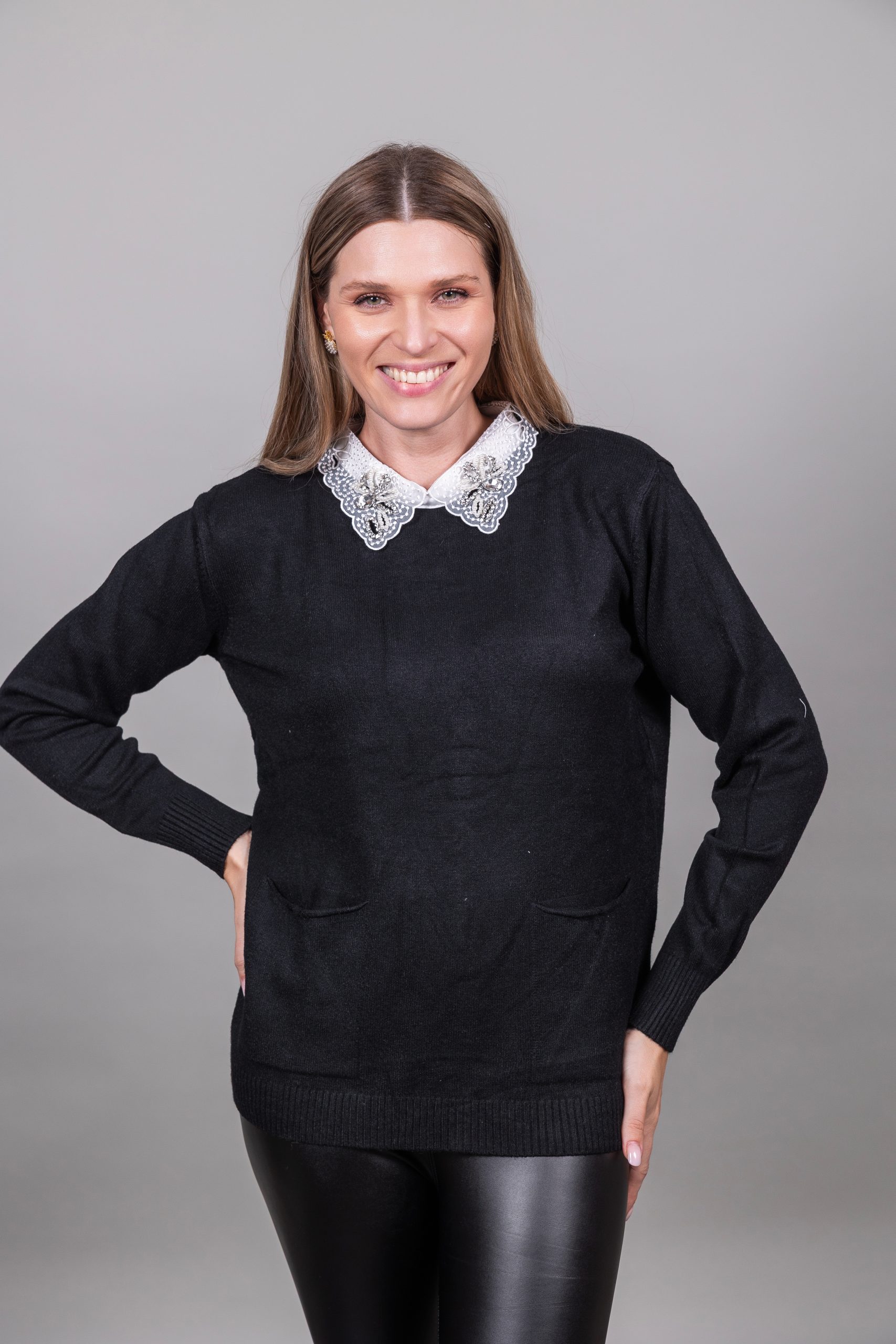 Πουλόβερ με γιακά δαντέλας και πέτρες με τσέπες