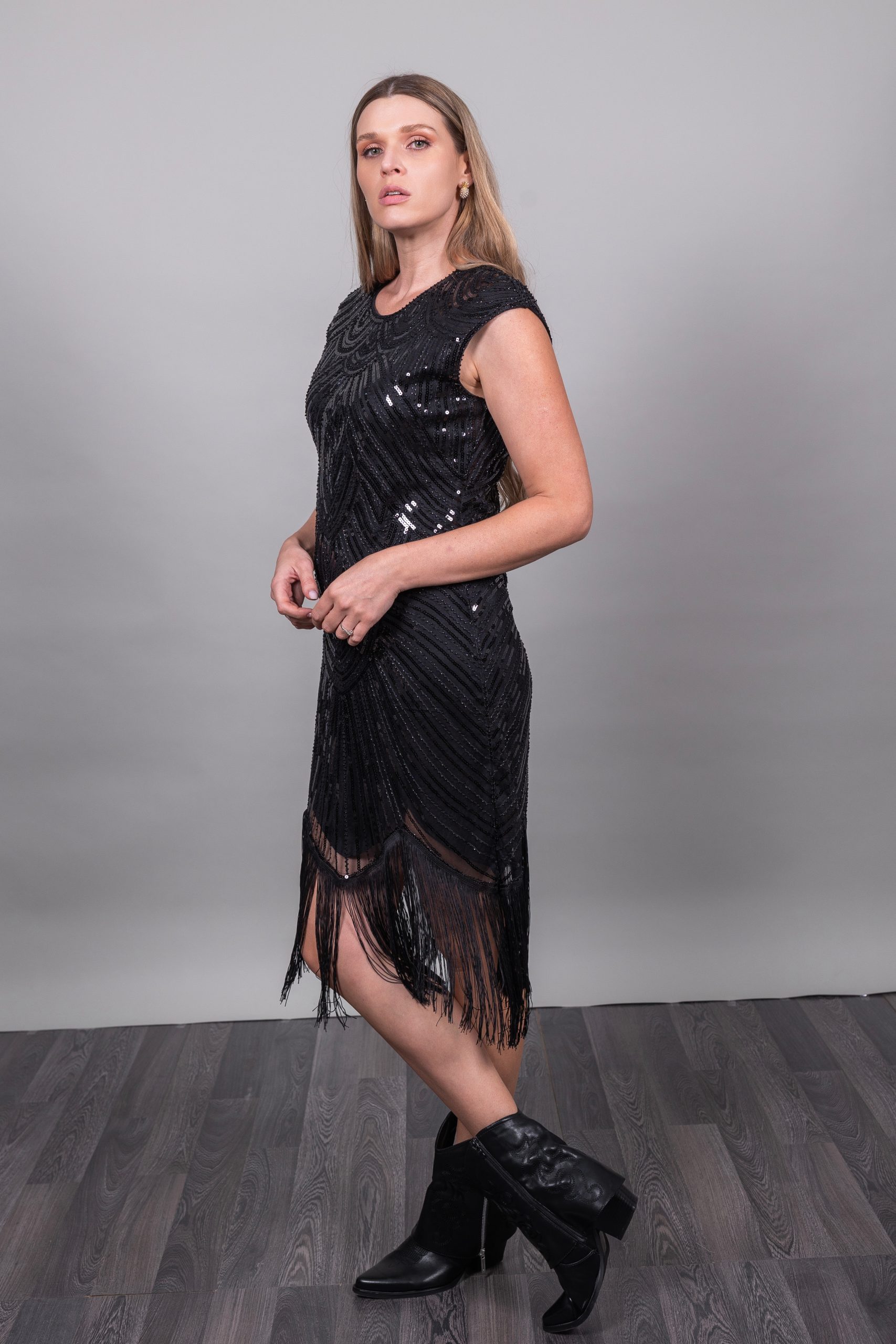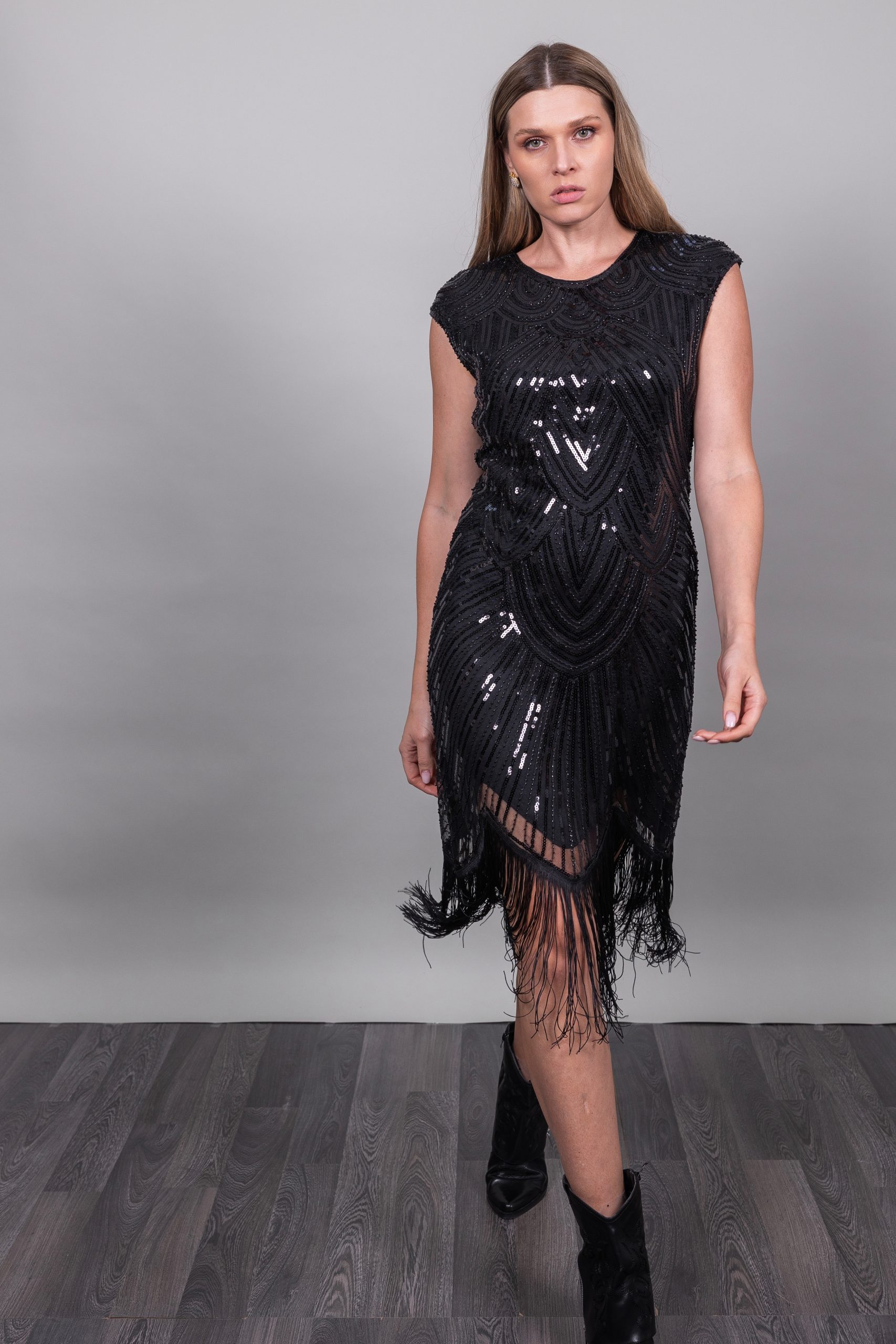 φόρεμα μαύρο σε ίσια γραμμή με παγέτες και κρόσια στο τελείωμα